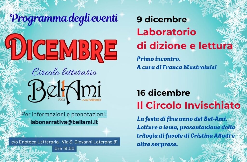 Avremo le letture sul tema delle feste, non solo quelle di Natale, ma le celebrazioni in generale, sia tradizionali italiane o qualsiasi altro tipo di festa, ricorrenza, si sia vissuto da qualche parte nel mondo. Chi desidera, può presentare i propri scritti o leggere opere di altri autori.